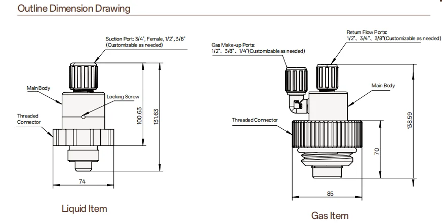Made of imported PTFE material, the threaded connector allows for secure attachment without causing the main body to rotate. The fitting is equipped with an internal check valve to prevent residual liquid from leaking during